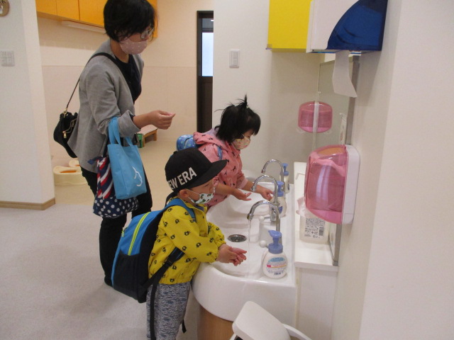 他のお子さん方も玄関前の消毒、検温、手洗い、消毒を行っています。