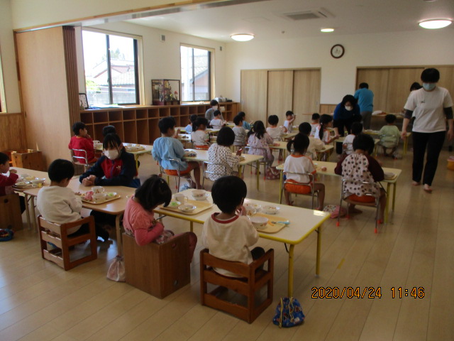 お子さんたちは机の配置に不思議そうにしていましたが、いつも通りに落ち着いて食べることができました。