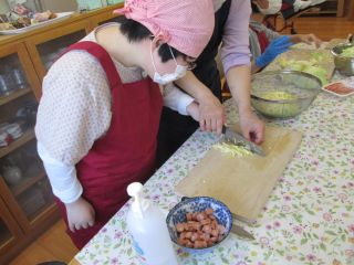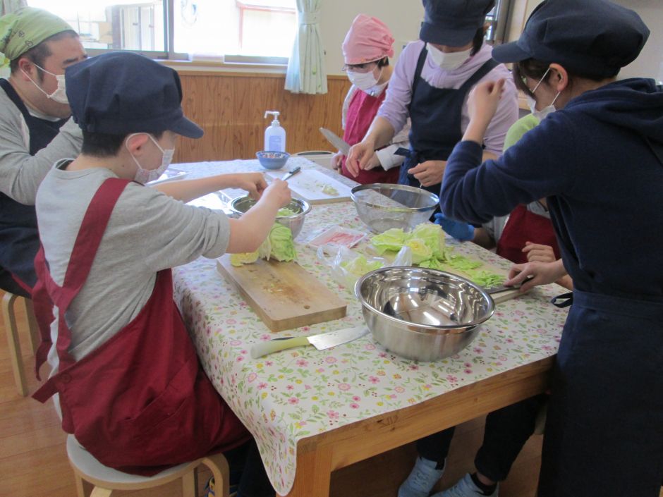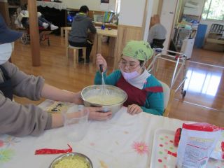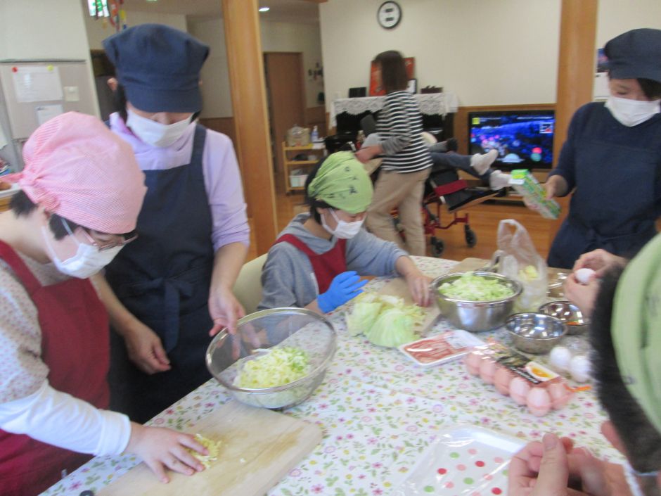 土曜日は、みんなで昼食作り!今回はお好み焼きです。材料を切る人、生地を混ぜる人、卵を割る人、それぞれ役割分担して作ります。「まだ~?」と出来上がるまでCDを聞いたりテレビを見たり、ゆっくり過ごす方もいます。