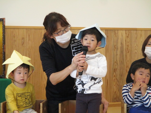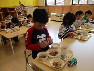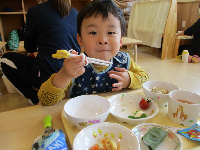 5月5日は「こどもの日」という事で、子どもの日のお祝い会をしました。男の子たちは兜を被り、みんなの前に立ち堂々と自己紹介をする姿が見られ、大きく逞しくなったなぁと感じる時間となりました。給食では、「子どもたちが健やかに成長していって欲しい」という思いから、ブリの煮つけや筍のおかか煮、柏餅が出ました。子どもたちも行事食を楽しんで食べていましたよ。