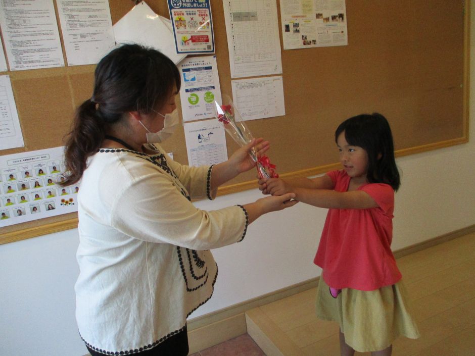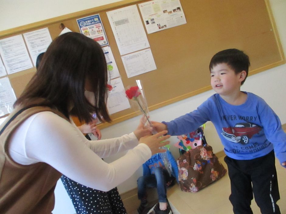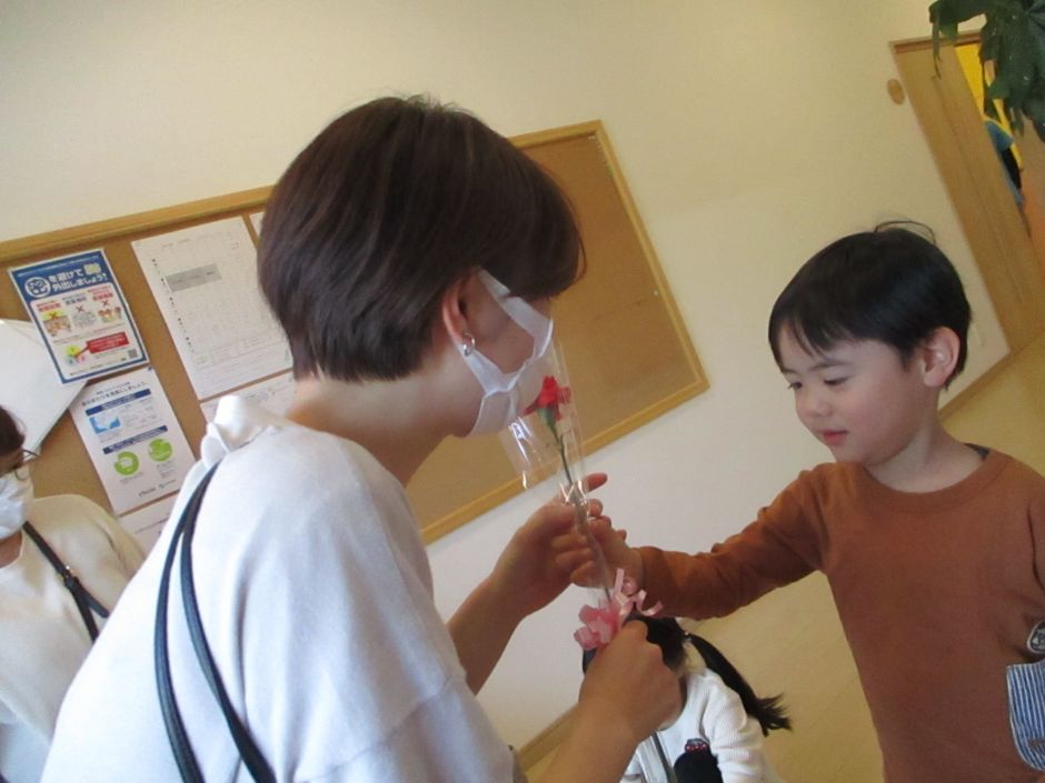 母の日のプレゼントとして、子どもたちからお母さんへカーネーションのプレゼントがありました。「いつもありがとう!」と照れながらのプレゼントにお母さんもうれしそう!ギューッと抱きあってたくさんの笑顔が見られました。