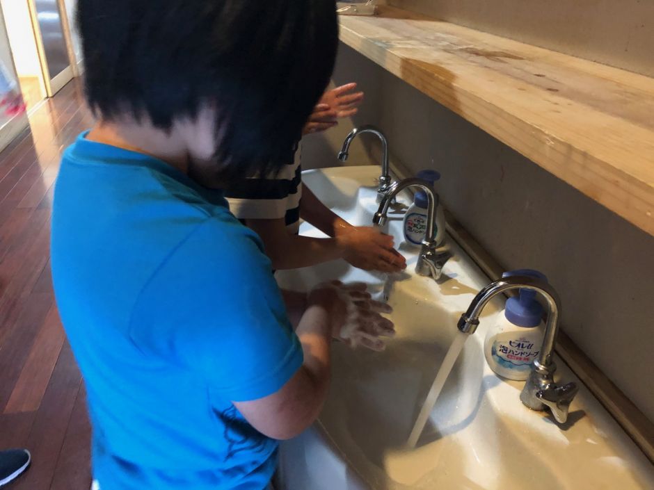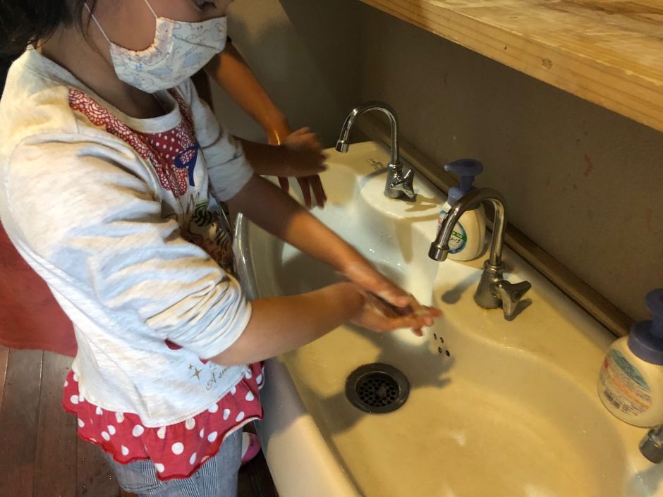 子どもたちは、目に見えないコロナウイルスのことも、少しずつ理解し意識できるようになってきました。感染症予防の手洗いは、ピコ太郎の動画を見て、遊びながら練習をしました。「ウォッシュ♬ウォッシュ♬」と言いながら、上手に手洗いできるようになっています。