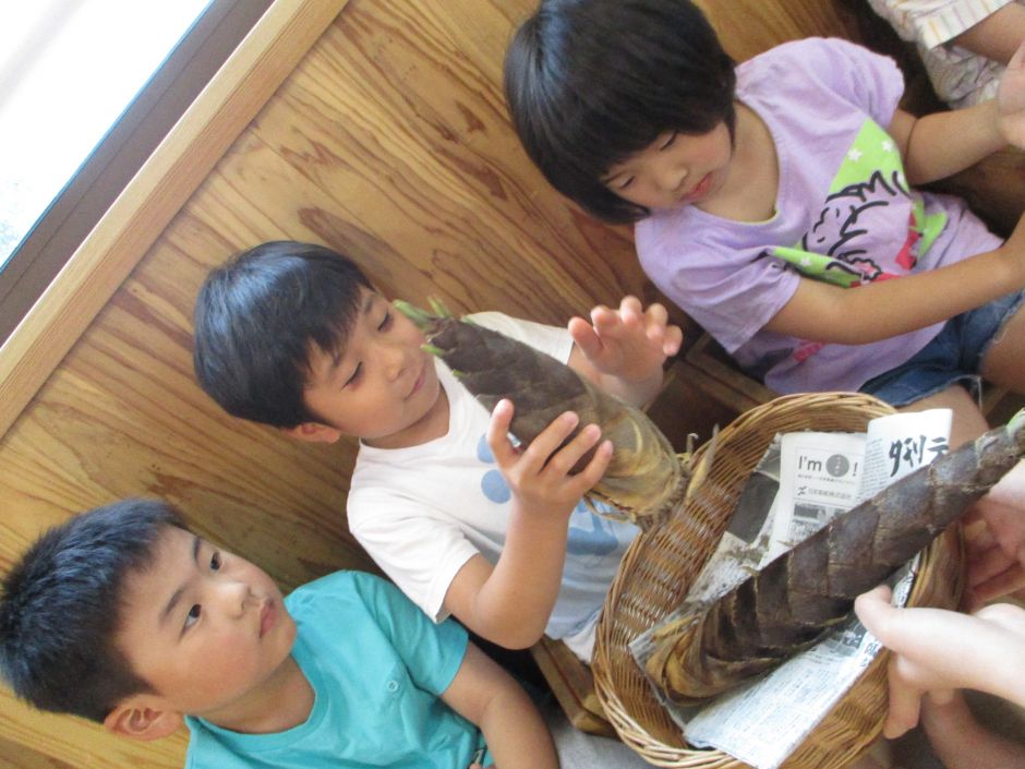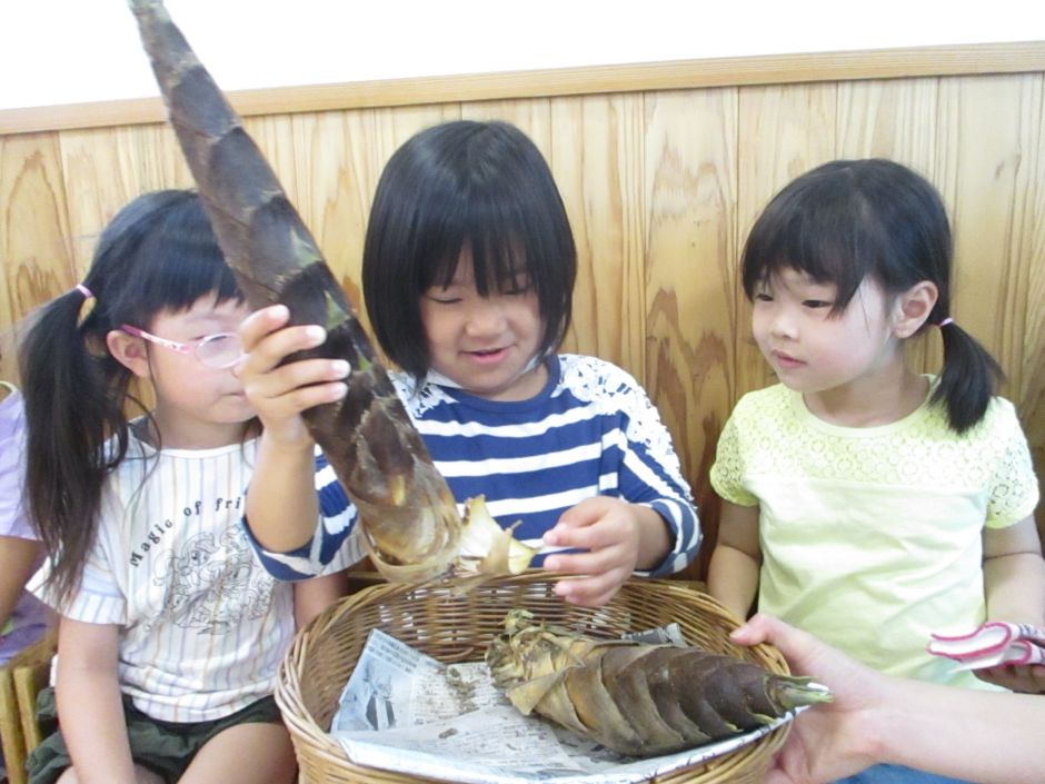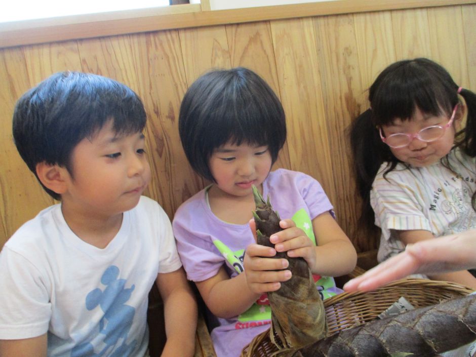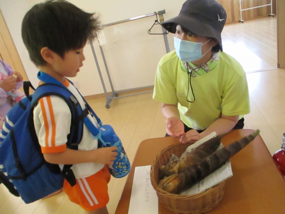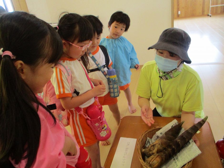 タケノコを頂きました!この前、給食のメニューに出てきたけれど、皮がついたままのタケノコって分かるかな?と思い、登園してきたらクイズを出してみました!「これなーんだ?」と聞くと意外に知っている子どもも多く「タケノコ!」と答えてくれました。見事正解者にはタケノコシールをプレゼント。初めて触るタケノコの触り心地に「ざらざらしてる」や「ちくちくする」などと言って感触を楽しんでいました。いい体験ができました。ありがとうございました!