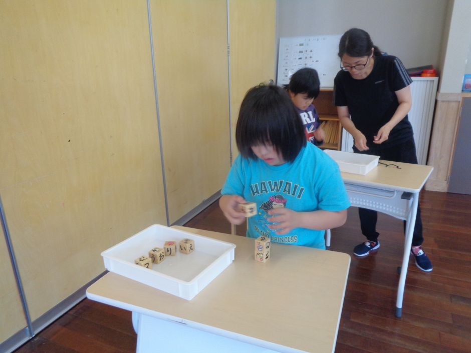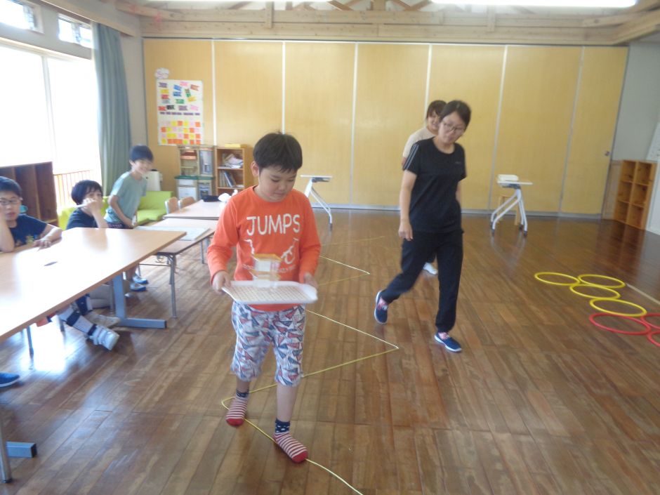 『チャレンジタイム』では作業療法士を中心に、テーマ(運動・机上活動など)の中で、それぞれチャレンジする目標を設定し、その目標に向かって取り組んでいます。今回は障害物競争にチャレンジしました。まずは準備体操で柔軟体操を中心にストレッチ!前屈で体を前に倒すと「いたたたた」との声も聞かれ、体の硬さもみられていました(^_^;)次はいよいよ本番!けんけんぱ→ストローの紐通し→積み木重ね→ジグザグ道のバランスのタイムを競いました。1つ1つ集中しながら取り組みつつ、速さを競う子どもたちでした。