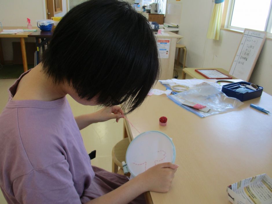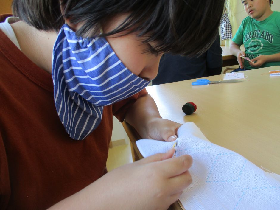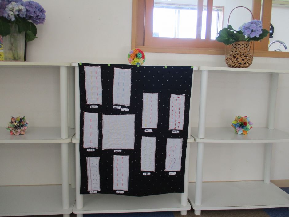 刺し子をした布を、活動の中でミシンで縫いつなぎ、1つのタペストリーにしてみました。子どもたちが取り組んできた作品の集合体です。 今月も刺し子に取り組みます。直線縫いから模様縫い、縫い目の幅など、子ども一人ひとりのペースに合わせ、自信が持てるように進めていきます。子どもたちの縫い物をしていく過程、手元に気持ちを向ける様子を大事にし、手仕事を深めていきます。