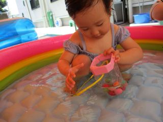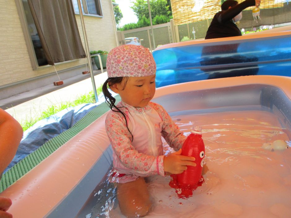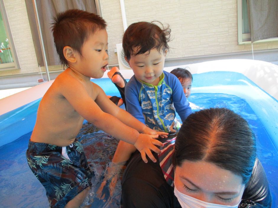 暑い毎日が続いていますが、てんとうむしグループの子ども達は元気一杯に水あそびやプールあそびを楽しんでいます。 プールの中では、ワニさん歩きやバタ足などにも挑戦してお友だちと同じ動きをすることを楽しんだり、ペットボトルに穴を開けたジョーロから水が出てくると手を伸ばして、水を触ったりかけ合ってあそぶのが好きな子どもたちです。 それぞれの楽しみ方をしながら、水あそびを満喫しています。