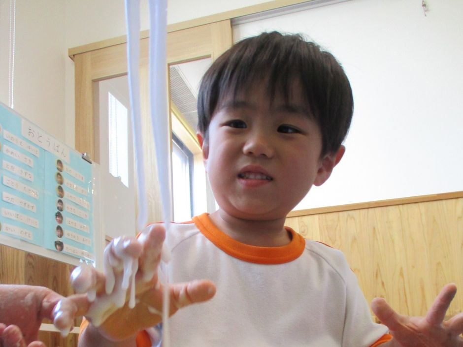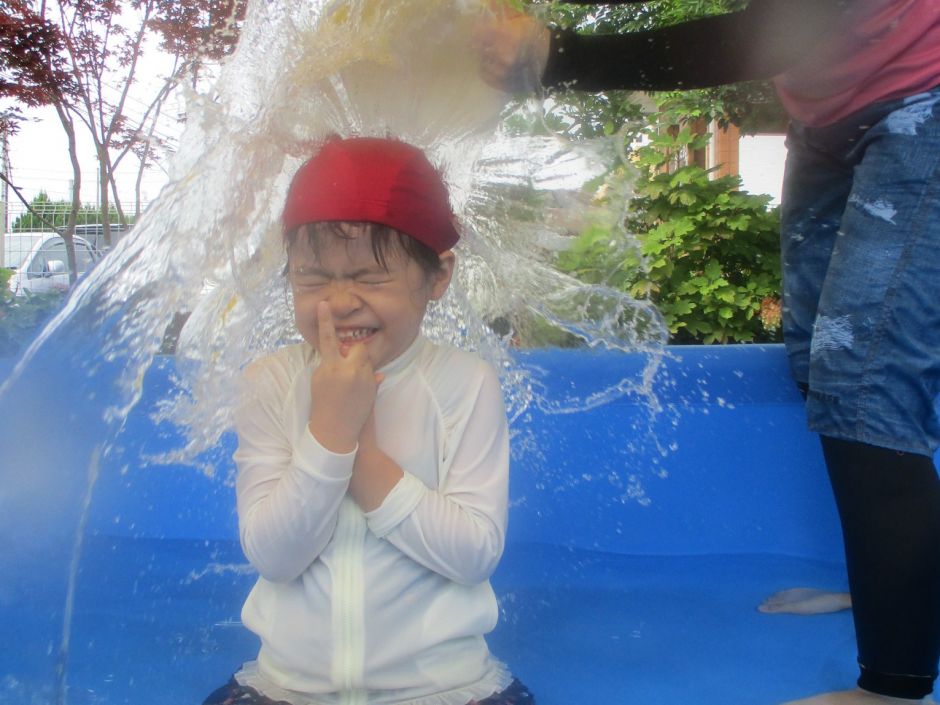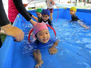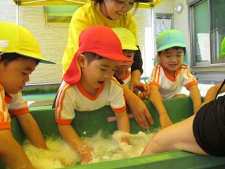 今年の夏は、晴れる日が多く、毎日水あそびをしました。初めは、水の冷たさにドキドキする姿がありましたが、バタ足やワニ歩きが楽しくなってくると「先生、みてみて」と意欲的にあそぶ姿に変わりました。忍者ごっこでの「水の修業」では水に耐える子どもたち。たくましくなりました!そして、泡あそびや粉あそびの感触あそび。十分楽しむことができました。楽しかった夏でした!