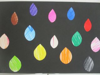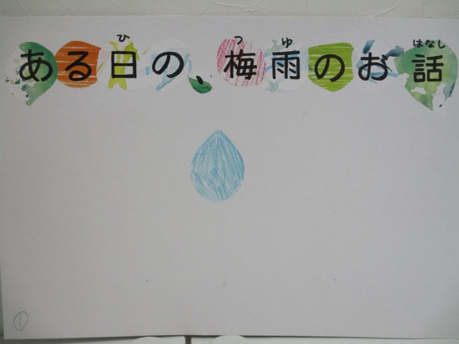 7月の半ばの梅雨真っ只中のある日、「梅雨」をテーマになかまメンバーみんなで、絵具や色鉛筆を使って色づけしたものを、職員が紙芝居風に構成し、1人の小学6年生の男の子が、言葉をつけて、1つの紙芝居に仕上げてくれました。