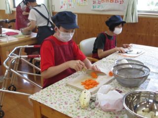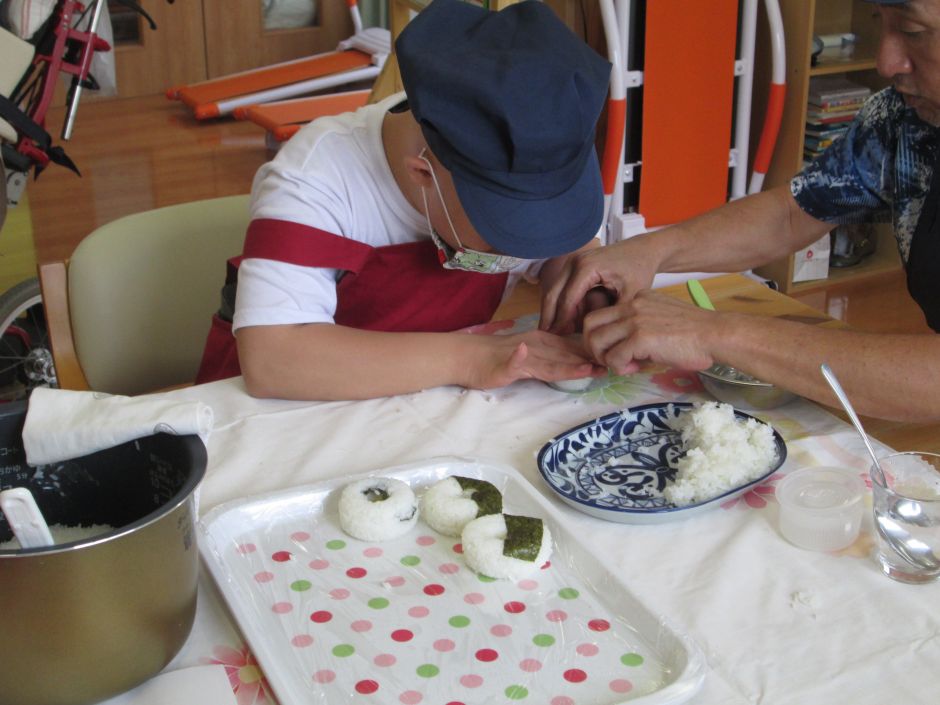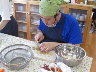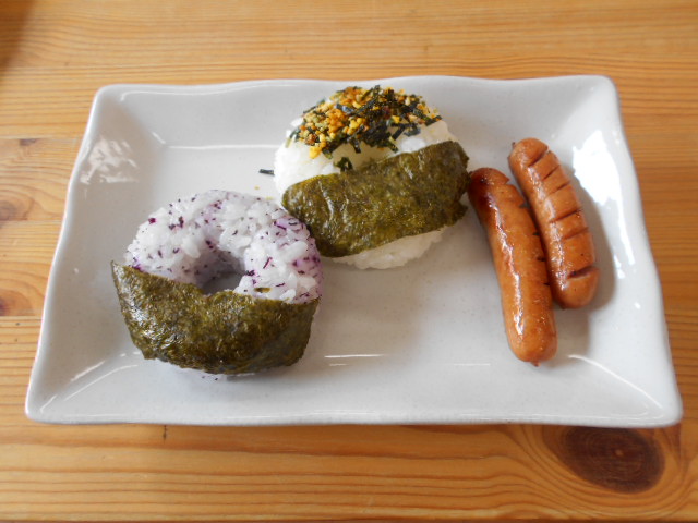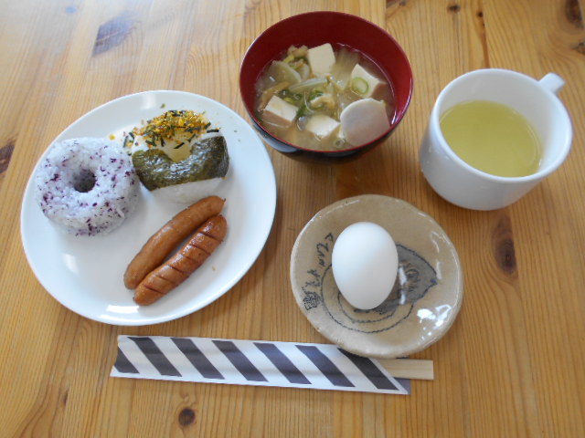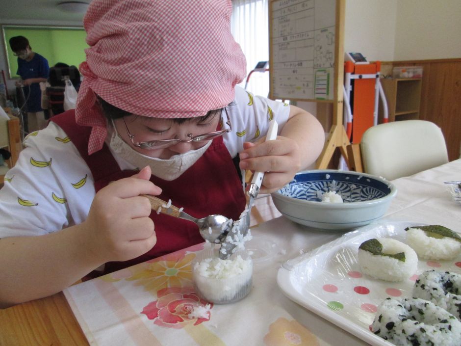 土曜日の昼食作り!ドーナツ型おにぎりと豚汁、ウィンナー、ゆで卵です。おにぎり係と豚汁係に分かれてレッツ!クッキング!!固いさつま芋、軟らかい豆腐、つるつるのこんにゃく、色々な感触の食材を上手に扱い、切り分けます。おにぎり係は、ドーナツ型にご飯をギュッと詰めて、海苔を巻き、もう一度ギュッ!クッキングの日は、普段よりたくさんおかわりがあって、みなさん嬉しそうにおかわりします。