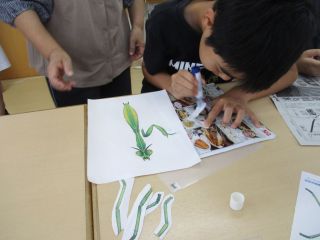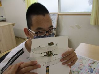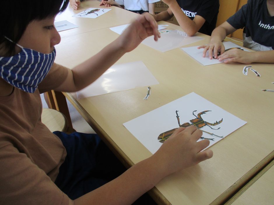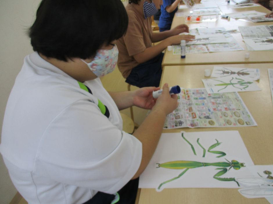 季節を感じる活動で虫の研究に取り組みました。1~2日目は公園に行き、虫採り網でバッタやクツワムシなどを採取し、なかまに持ち帰って、体の観察です。動画で虫の声も聴きました。3日目は、虫の図を使って羽や足が体のどこにあったか、まず自分で考えながら、胴体に貼ってみました。胴体だけになると意外に難しい作業です。次に見本を見せると、「ここから生えてる。」と貼り直すお子さんもいました。最終日は、画用紙にそれぞれのイメージで虫を描いて、研究を終了しました。