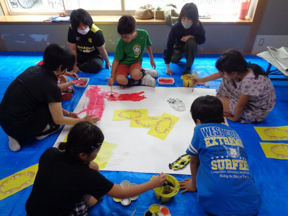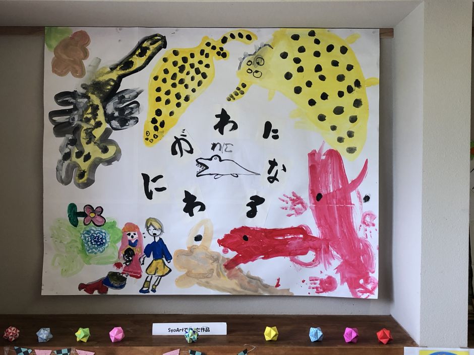 土曜日に高学年がSyoArtの活動をしました。今回は、絵本の「わにがわになる」をテーマに、文字や絵に挑戦。講師の先生に一人一人指導して頂きながら、一文字ずつ担当して仕上げていきました。ワニの絵は、みんなの個性が出て、それぞれ違う仕上がりになりました。個性豊かなワニが、「ひまわり」の玄関を明るく飾ってくれています。