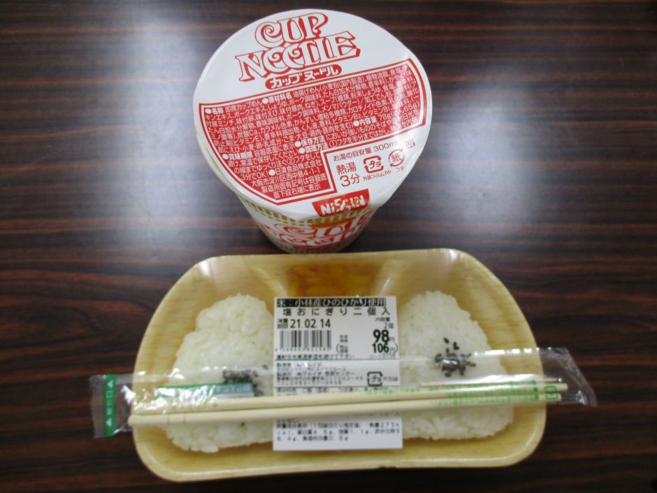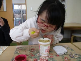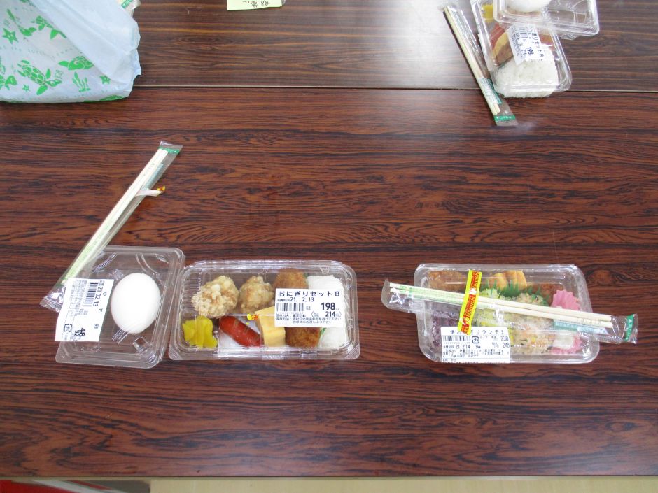 昼食の予算は、300円に設定していました。職員と一緒に電卓を使って計算しながら、選びました。うまく予算内でデザートのお菓子も買えたり、欲しい物が予算オーバーして再度職員とともに買える物を探したり、カップそばと総菜の海老天を選んで“天そばセット”にしたりなどなど、それぞれに考えて購入しました。