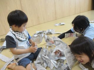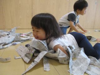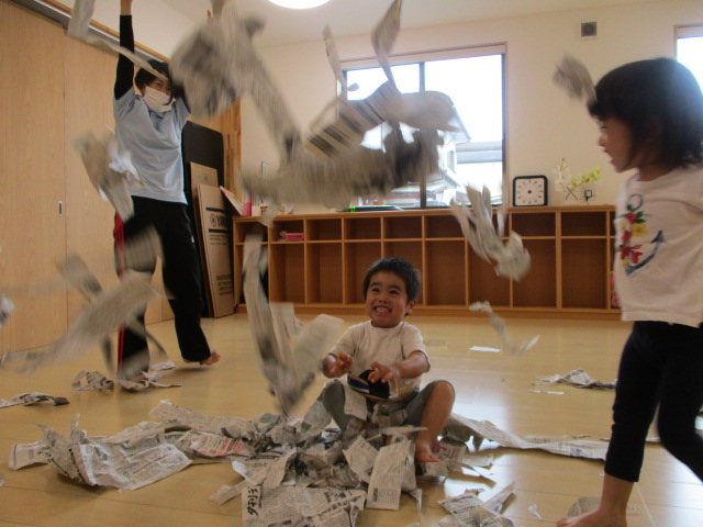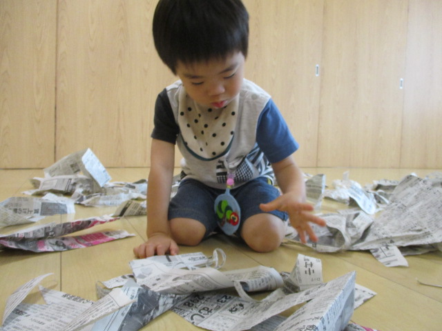 今日はみんなで紙あそび!!新聞紙で「いないいないばあっ!」をして遊んだり、ビリビリビリ・・・・やぶりますいっぱい、いっぱいやぶったら新聞紙のお水のかけあいっこ!!「えぃ!」「わぁー!」と声も上げて盛り上がる!最後はみんなで「ザッバーン!!」雨が降る季節になってきたのでみんなでお部屋でもたくさん遊んで楽しみたいと思います♪