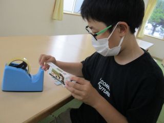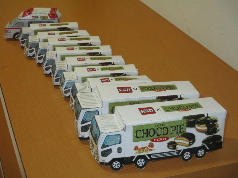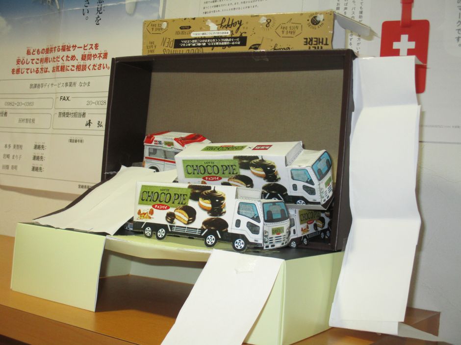 毎日「チョコパイのトミカのペーパークラフトがやりたいです。」と職員に訴えていました。職員がダウンロードに挑戦しましたが、できず・・・。そこでお店でチョコパイを買ったら、箱の裏についているぞとの話になりました。職員が買ってあげるのは、簡単でしたが、彼は家族に何度も頼んで、購入してもらったようです。「コピーしてください!」とうれしそうにチョコパイの箱の裏を切りとって、持ってきていました。それから作ること、作ること、大中小のチョコパイトラックを10台完成させました。