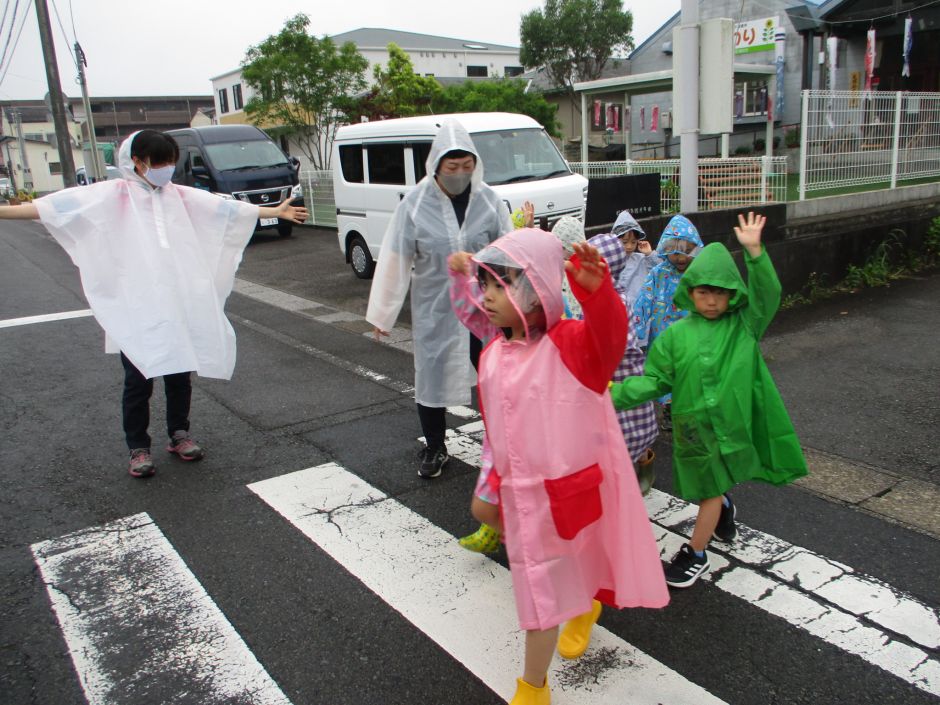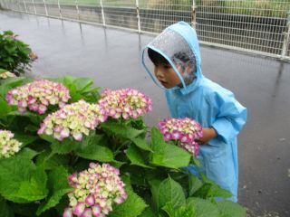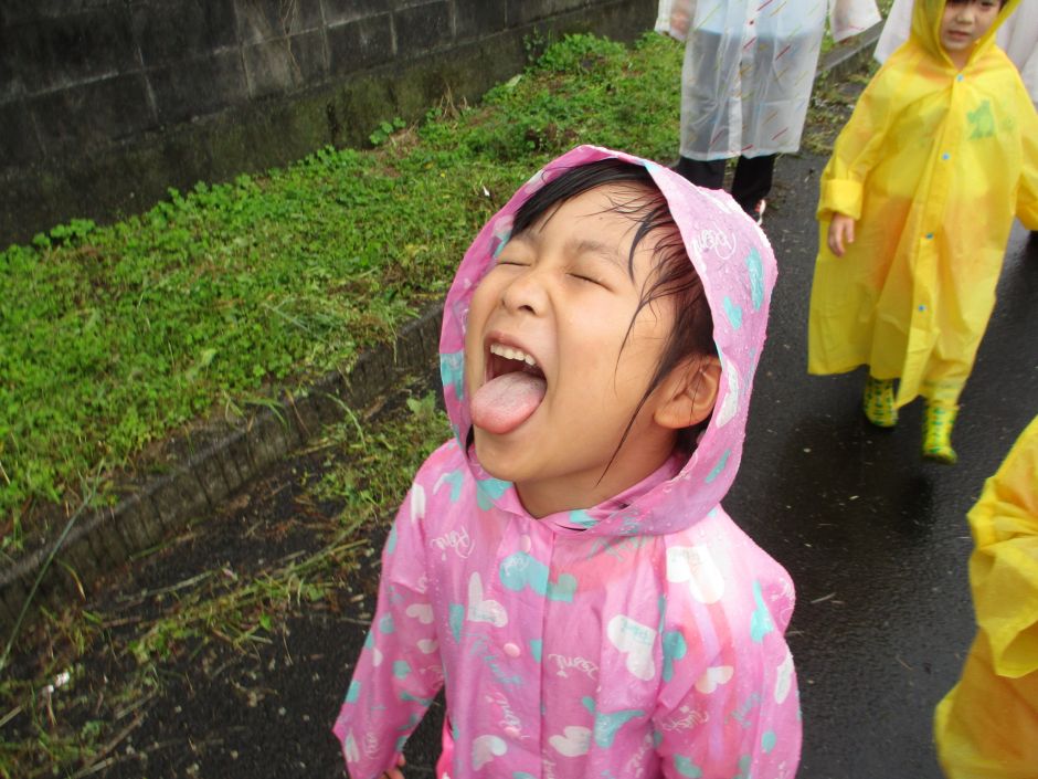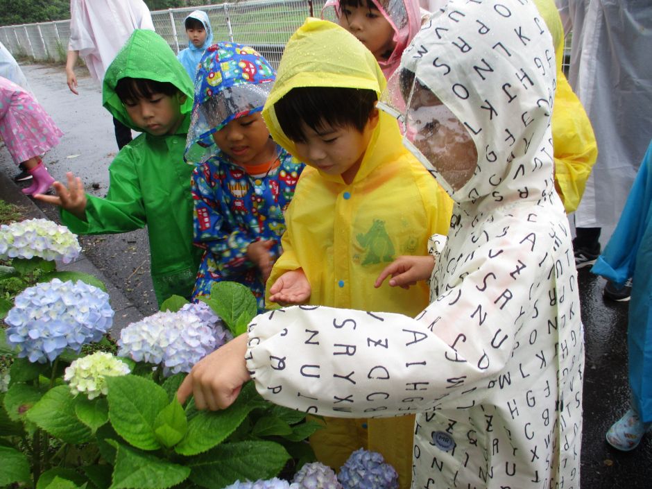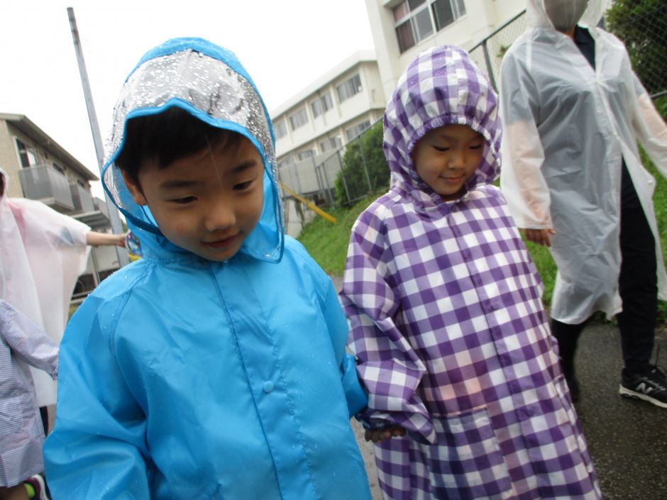 雨降りの中カッパに着替えて、お散歩に行きました。長靴で水たまりに入ったり、アジサイに巣を作ったクモを見つけたり、「デンデンむしむしカタツムリ~♪」と歌ったり、静かに耳を澄まして、カッパにはじく雨の音を「ポツ、ポツ、ポツリ」と聞こえてくる体験もしました。晴れの日と違い雨の日ならではの散歩を楽しみました。