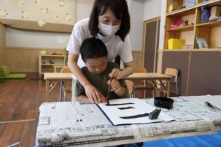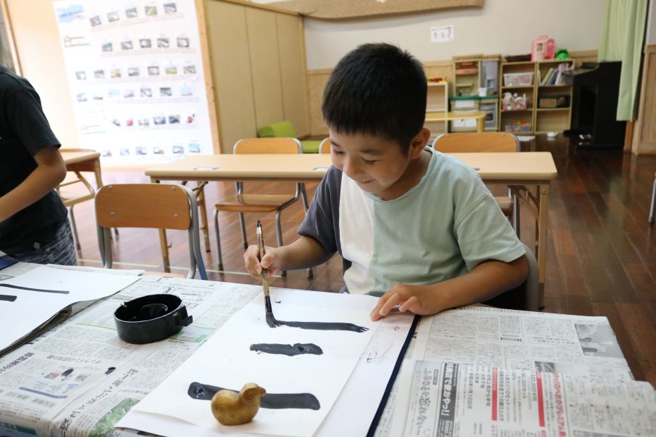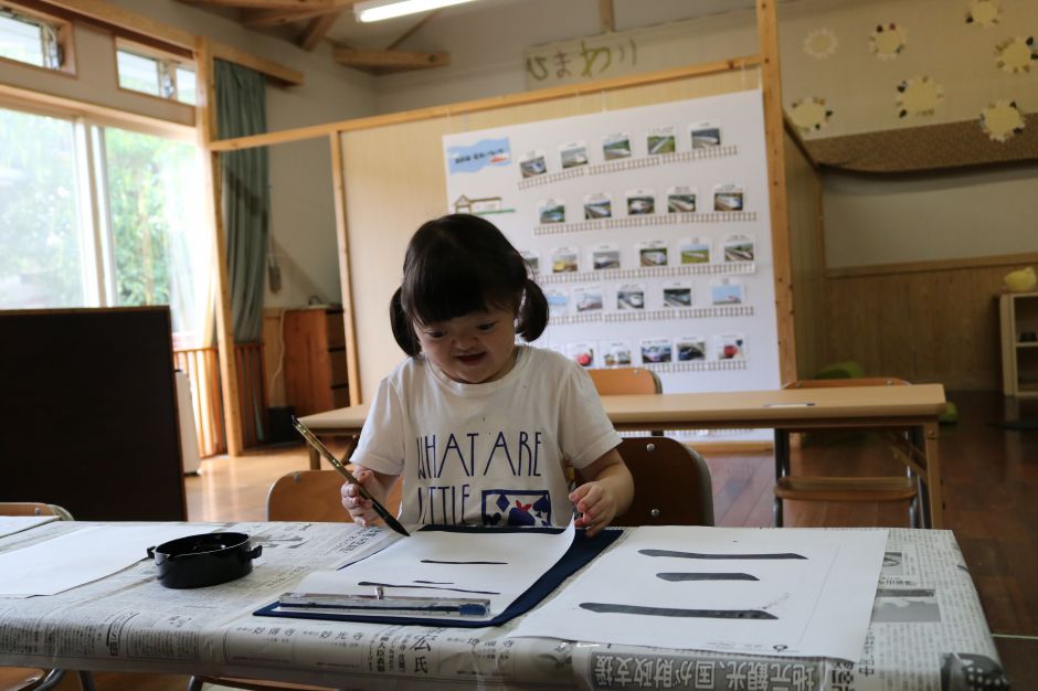 いるかグループ初めてのSyoArtをしました。最初は、みんな緊張した様子で表情も硬かったけど・・・先生から手をとって教えてもらうと、緊張もほぐれて、みんないい表情♪けれど、書き始めると今度はみんな真剣な顔!とっても楽しかったね!今度はいつかな?