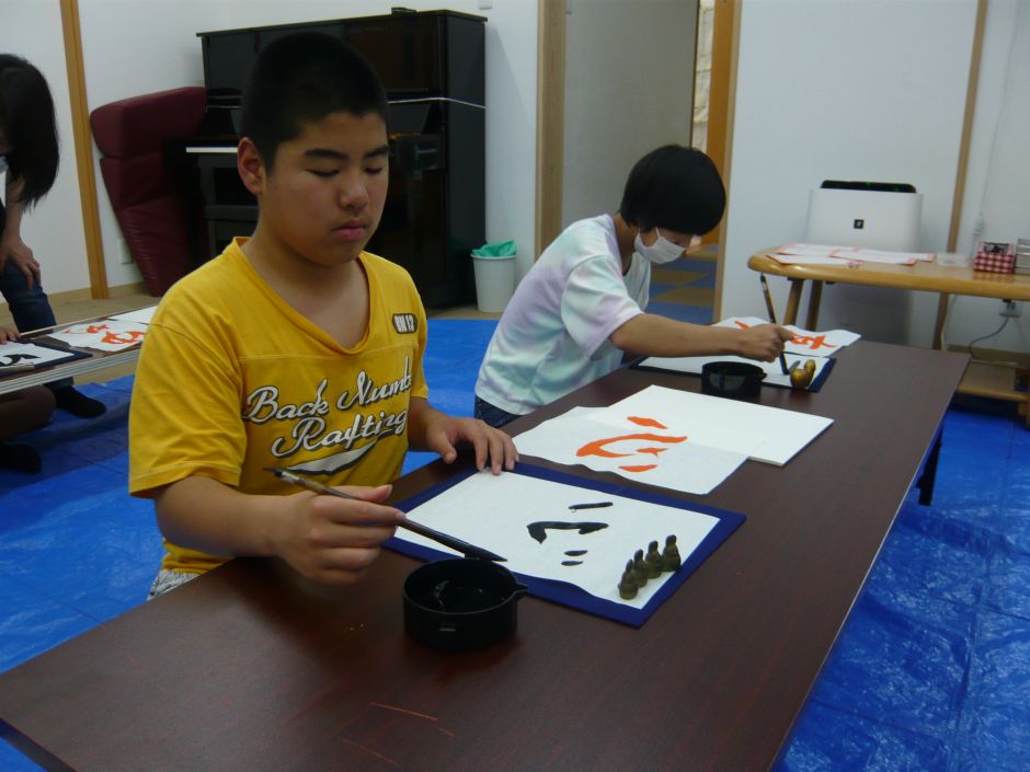 先日のSyoArtでは、書の小野先生が用意されたいくつかの手本の文字から、子どもたちが各々選択して取り組みました。みなさん、落ち着いた雰囲気の中で、自然と静かに筆を動かしていました。後半になると、「これ、どう?」「おー!」「いいねぇ。」等など、お互いの作品の感想を言い合い、和やかになっていました。