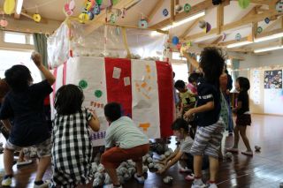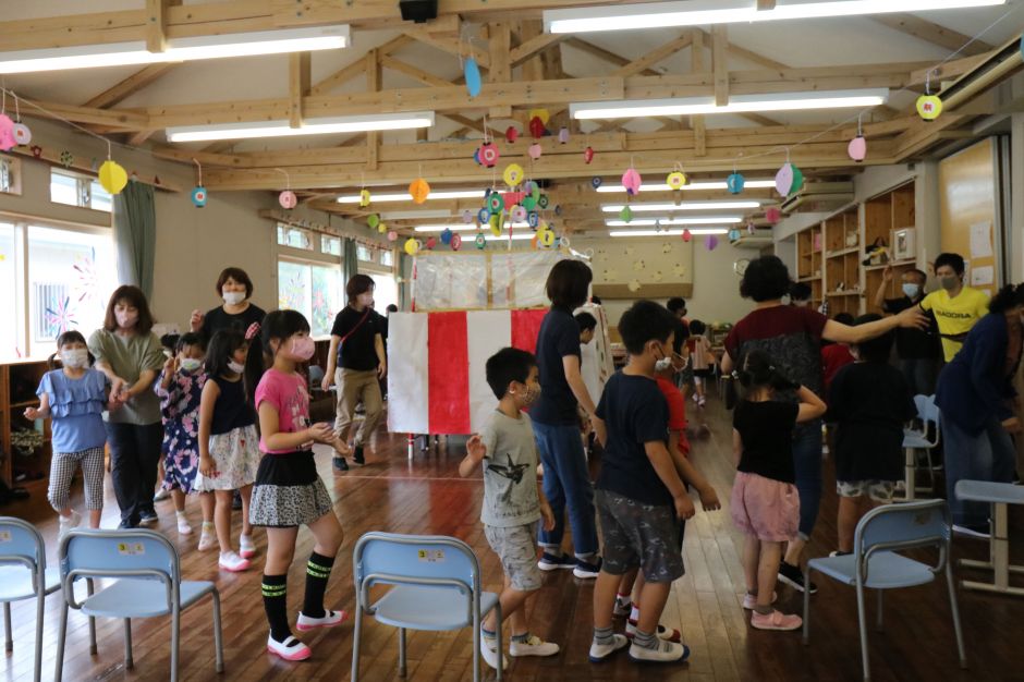 祭りの雰囲気を子どもたちに味わってもらおうと、提灯の飾りを子どもに作ってもらい、やぐらを建ててその周りをばんば踊りで回りました。途中、音楽が止まると、イス取りゲーム、音楽が『千本桜』に変わると、その曲が流れている間は玉入れなど、楽しい遊びも盛り込んで、子どもたちも大喜びでした。