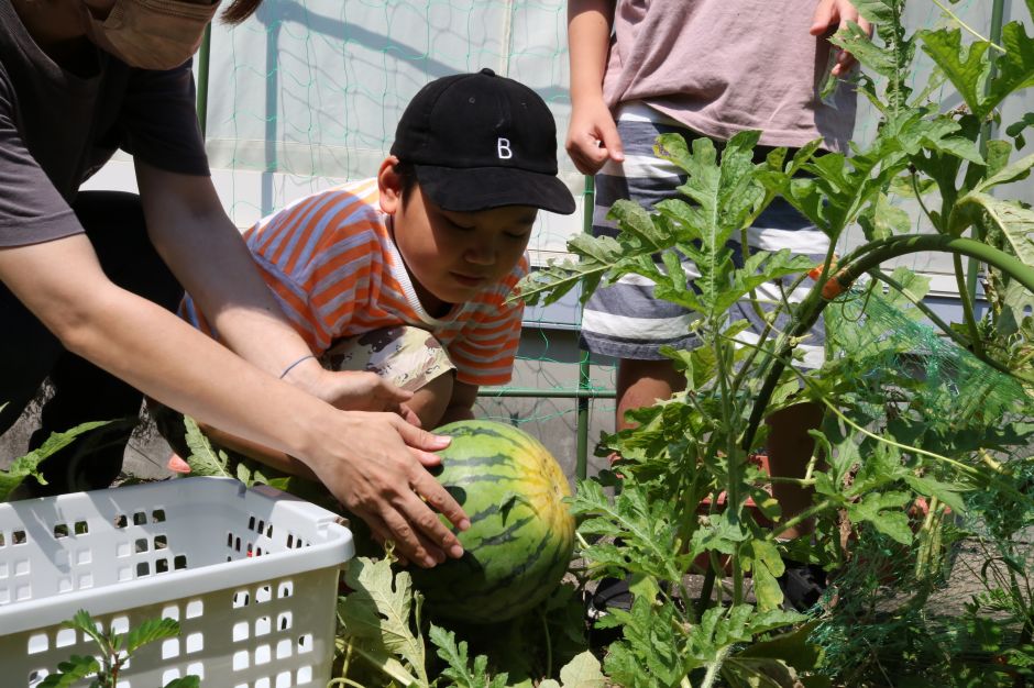 そのスイカが今年初めて、ひまわり菜園で収穫に至りました‼しかも結構大きなサイズ。