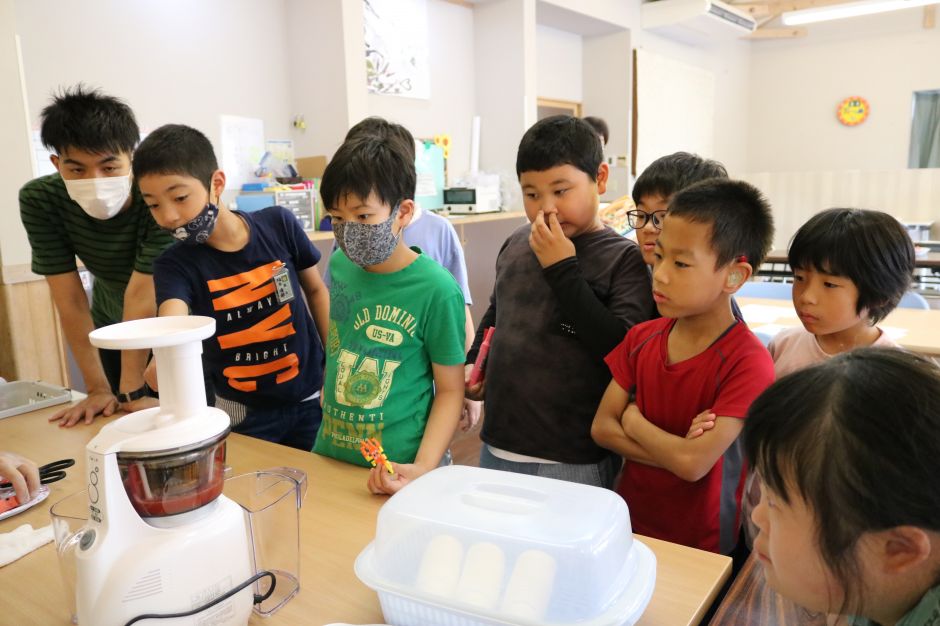 1口サイズに切ったスイカが次々にスムーサーの中にとび込み、ジュースが絞り出る様子をくいるように見つめる子どもたち・・・果たしてそのお味は…?