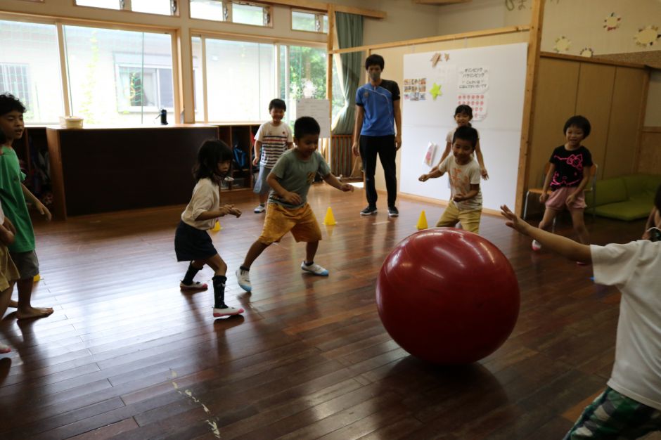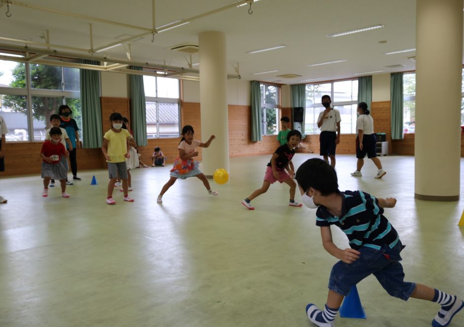 雨の日が続く日々ですが、キャッチボールやボールあて鬼ごっこ等、室内で出来るボールあそびで体を動かしながら楽しんでいます。その中で今、いるかグループの子ども達が特に熱中している遊びが、ころがしドッジボール!ボールをころがす側も、逃げる側も、全力で楽しんでいます。何度も何度も遊んでいくうちに、ころがし方を工夫したり、お友だちと連携プレーを見せたりと日々進化を遂げています♪これからも雨や暑さに負けず、楽しく夏休みを過ごしていきたいと思います。