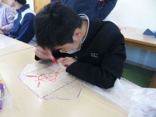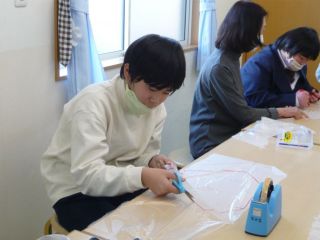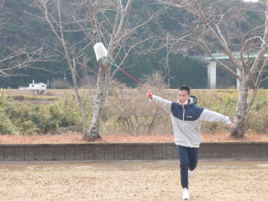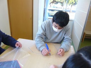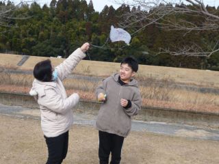 凧あげに行くことを目的に、凧作りをしました。型紙に合わせてペンで線を引いたり、はさみでビニールを切ったりしました。ビニールがずれやすいため、「ここ押さえててください。」や「してください。」と職員にお願いする姿も見られました。絵をかいたりシールを貼ったりして自分だけの凧を完成させました。凧あげ当日は、ゆるーい風・・・。おもいきり走って走って、あげて見る子どもたちと職員でした。