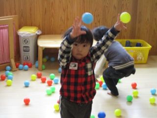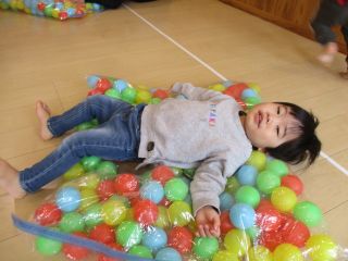 てんとうむしグループでカラーボールあそびをしました。大きな袋にカラーボールを入れて出すと、最初は「これは何だ?」と触ってみる子どもたち。保育者が遊ぶ姿を見ると、一緒になってボールの上に寝転んだり、乗ってみたり♪最後は袋からボールを出して投げたり、転がしたりして遊びました!