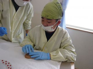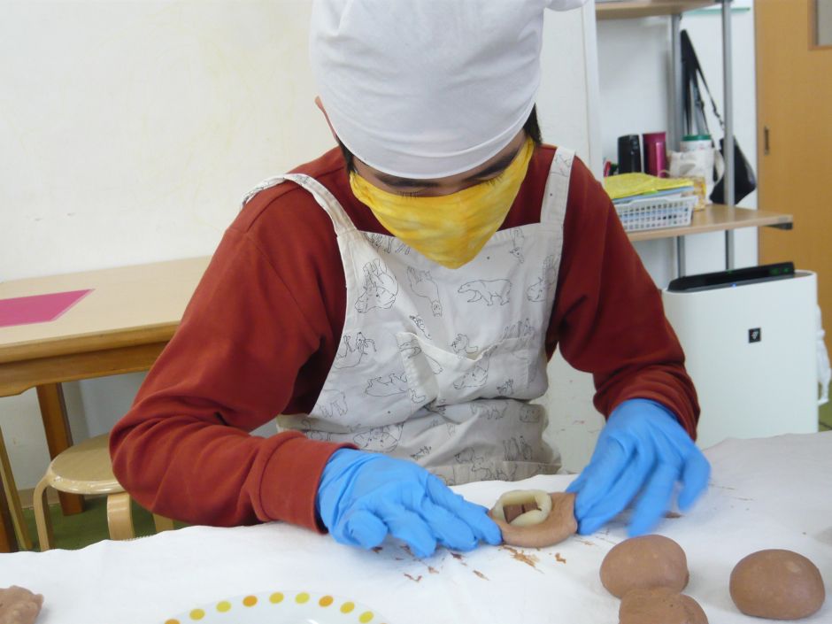 今回のパン教室は、¨チョコあんパン¨作り。前回あまりのおいしさにリクエストしてのパンでした。 講師の先生から教わりながら、ココアパウダーの入った茶色の生地をカット、計量、丸め方など、それぞれに分担しながら行いました。くり返しの体験が力になってきていることを感じました。 中身は、チョコとしろあん。焼きたてのあつあつ甘~いパンに、子どもたちの顔がほころんでいました! ※コロナ感染対策で、手袋をして、できるだけ距離をとって取り組んでいます。