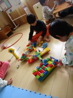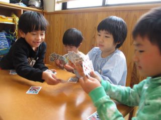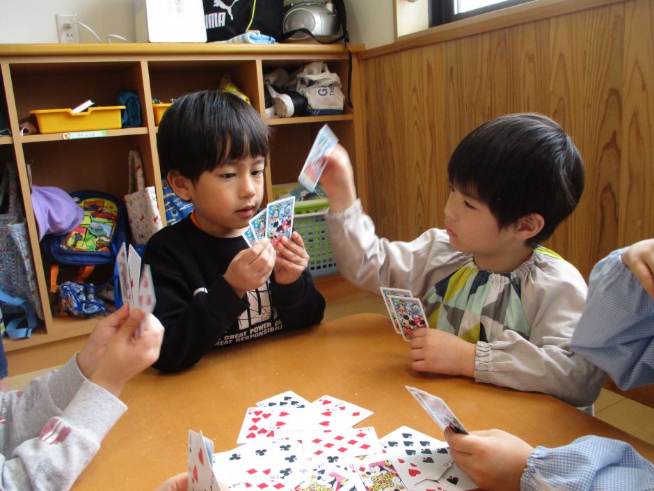 たいようグループさんは、友だちとあそぶことが大好き!中でも、カードゲームで「ババ抜き」をすることが楽しくてカードを配る時から、ドキドキ・ソワソワしています。配り終わったカードを見て、ジョーカーがあると思わずニヤニヤしてしまいます。また、ブロックで好きなキャラクターを作って保育者や友だちと一緒に大きいものを作ってそこからファンタジーあそびをしたりと面白くて楽しいことを沢山教えてくれる子どもたちです♪