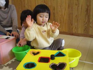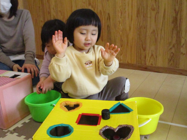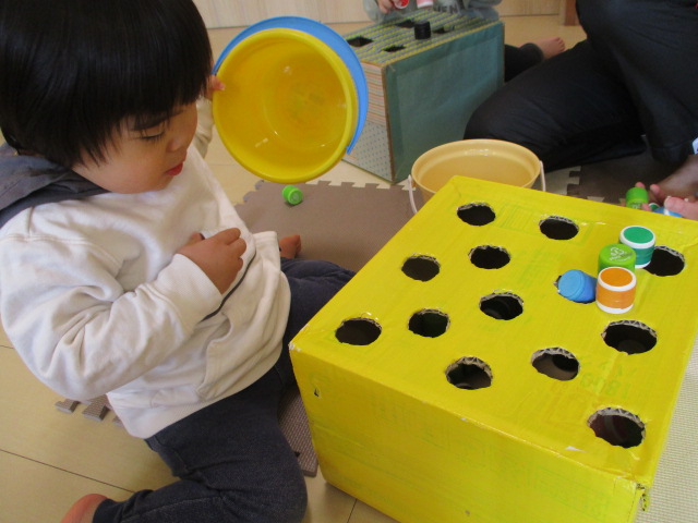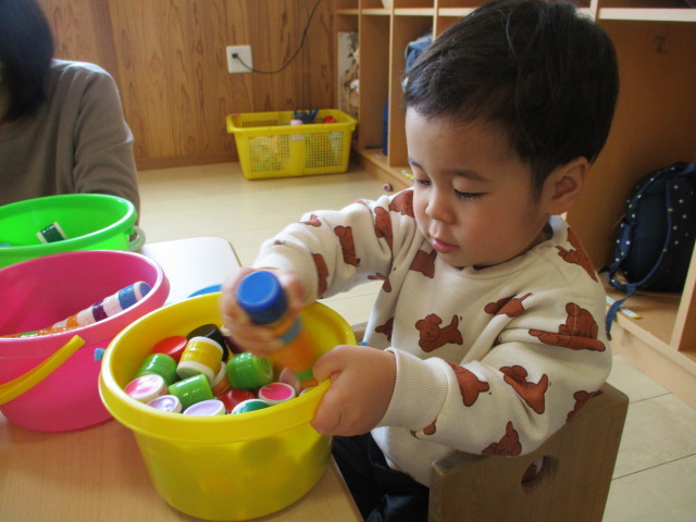今日のてんとうむしグループのあそびはキャップあそび♪キャップの入ったバケツが出てくると、ひっくり返して“じゃー”と鳴る音を楽しんだり、箱の中にぽっとん!して遊び始めます。バケツの中にキャップを入れて、長い棒で混ぜ混ぜ・・・お料理をしているお友達もいましたよ。