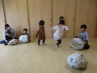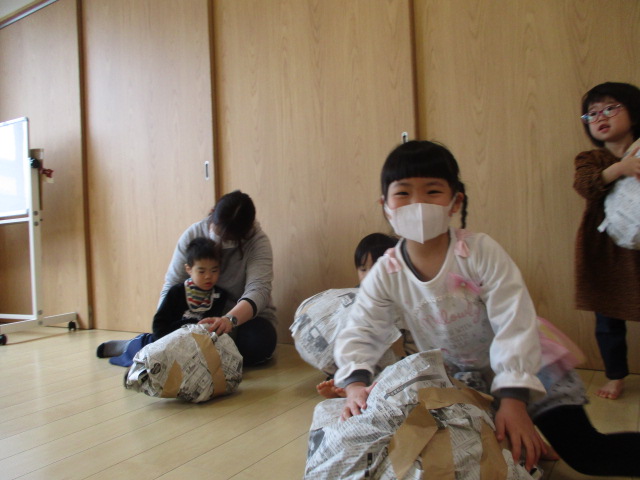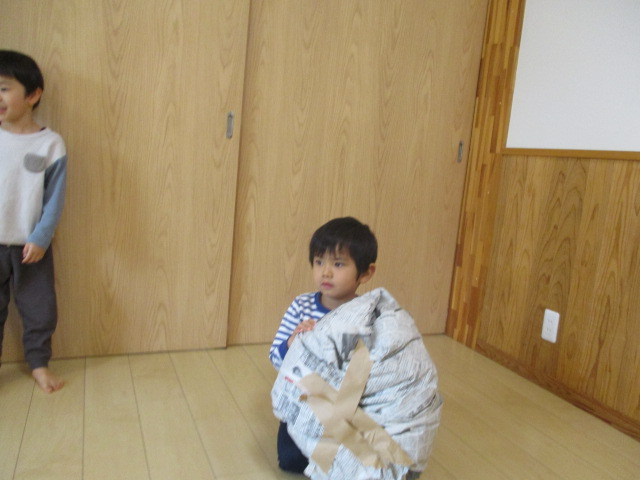 ちょちょグループで紙あそびをしました。新聞紙で作った大きなボールを子どもたちに見せると「おっきいね」「投げてみる!」ととっても張り切った様子!投げたり転がしたり破いてみたり思いっきり身体を動かしてたのしみました♪