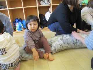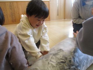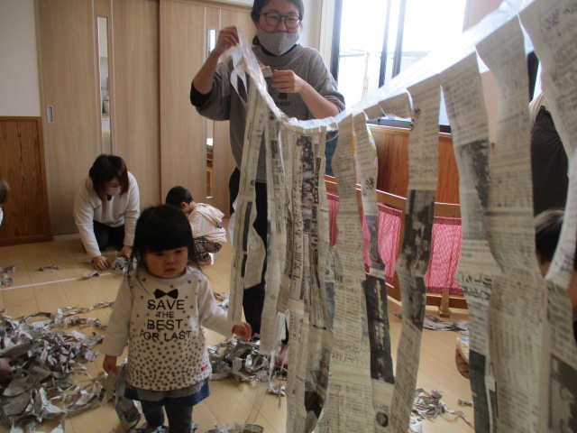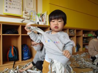 今日は紙あそびをしました。新聞紙の入った長~い袋が出てくると、「これはなんだろう?」と覗き込む子どもたち。触ったり、叩いたり、座ってみたり・・・いろいろな遊び方をしました♪最後は部屋いっぱいに紙を広げて、全身で紙の感触を感じながら遊びました。
