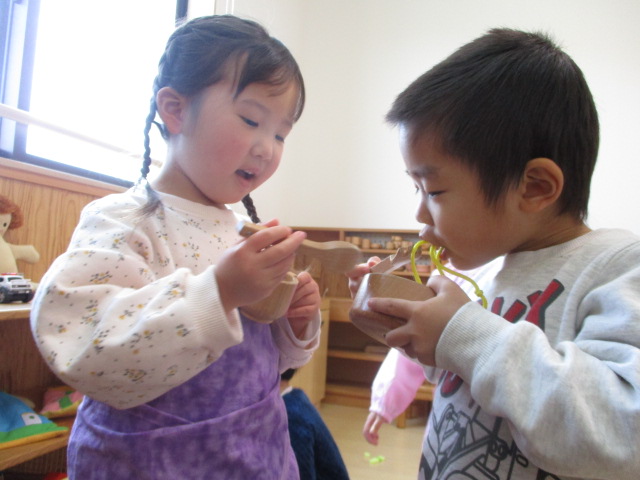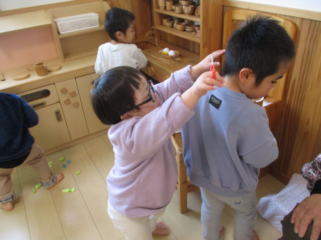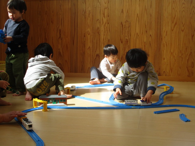子どもたちが大好きな自由あそびの時間♪ 今日も好きなおもちゃで遊び始ます!乗り物が大好きな友だちは、プラレールの線路をつなげて、つなげて、いつの間にかみんなで長ーいコースが出来上がり!ままごとが大好きな友だちは、今日も美味しいご馳走を作ってくれました!時々美容師さんも登場して・・・夢中になって遊ぶおもしろい子どもたちの姿があります。友だちと先生が絵本を読んで盛り上がっていると・・・そこにもみんなが集まって来ます!今日も楽しい食後のまったり時間になりました~♪
