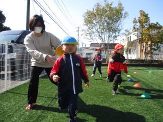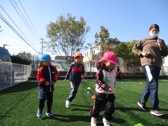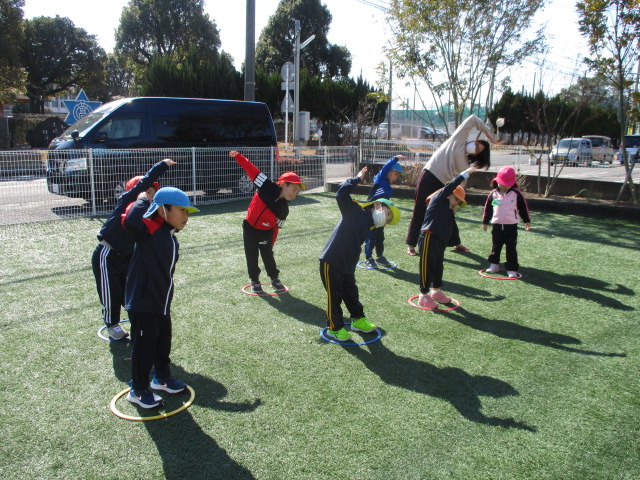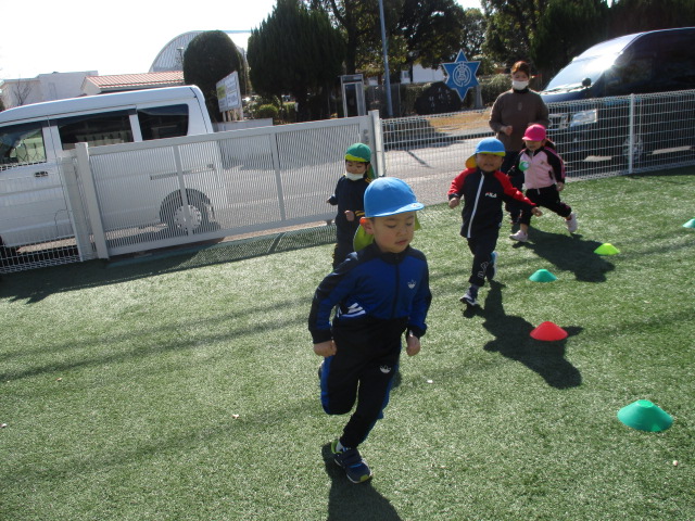 かぜグループは、お気に入りのジャージ上・下を着て、ぐんぐん(マラソン大会の練習)を、今日はあははの園庭で行いました。まずは、ドラえもんラジオ体操をして、しっかり体をほぐした後は、3分間、流れる音楽に合わせて走りました。競争心も芽生え「みんな抜かしたよー。」と言ってくる子や、転んでもすぐに立ち上がり時間いっぱい自分のペースで走る子の姿もありました。明日は堤防に行って走ります。マラソン大会の練習がんばるぞー!