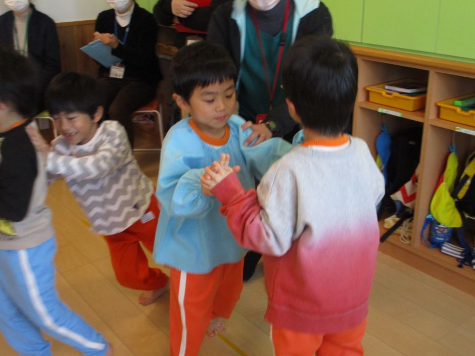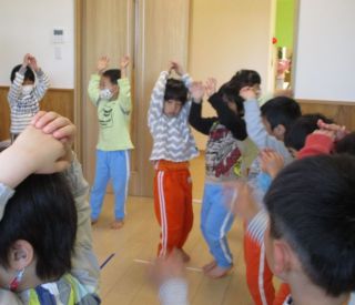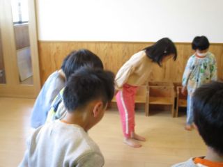 朝、冷えている体や目覚めていない体を動かして今日も一日頑張ろう!という想いを込めて体操をします。腕を大きく上に伸ばしたり、横に伸ばしたり、友だちと押し合ってみたり…気付けば、体もポカポカ、友だちと向かい合って「おはよう!」そして触れ合って「今日も、元気!」とニコニコ♪ほんの少しの時間の体操ですが、1日始めの子どもたちの元気な姿が見られる特別な時間です。