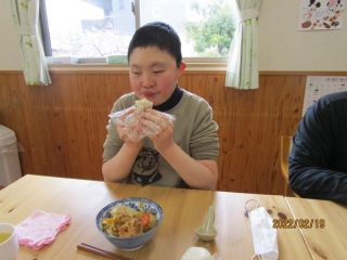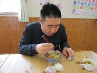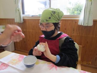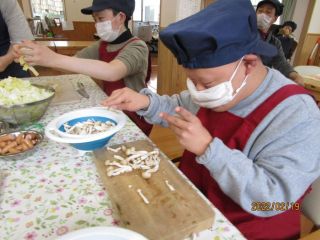今回は、みんなでお鍋!!野菜を切る人と、おにぎりを作る人に分かれて、作業しました。包丁で切る人、きのこを手でほぐす人、ラップでおにぎりを握る人、それぞれ得意なところをやりました。皆さんおかわりして沢山食べました。
