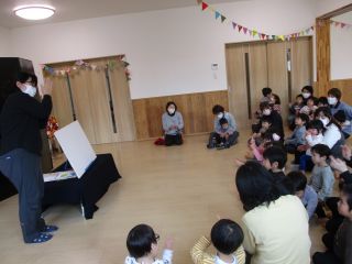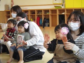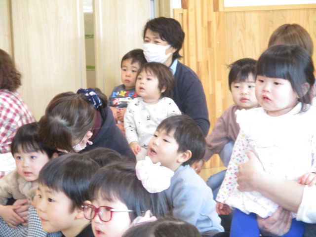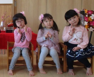 今日は、あはは部門でひなまつりのお祝い会をしました。朝登園をしてくると、部屋に飾ってあるガーランド見上げ、「あ!!」と指差す子どもたち。いつもと違った雰囲気に、わくわくした表情を見せていました。ひなまつり会では、みんなで歌を歌ったり、踊ったり、パネルシアター(ふしぎなたまご)を見ました。女の子たちは髪飾りをつけて、みんなの前でごあいさつ!赤ずきんちゃんも遊びに来てくれて、とってもうれしそうな子どもたちでした。