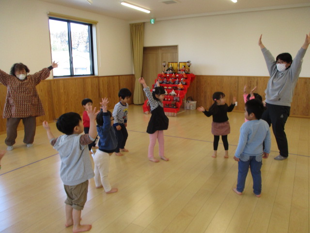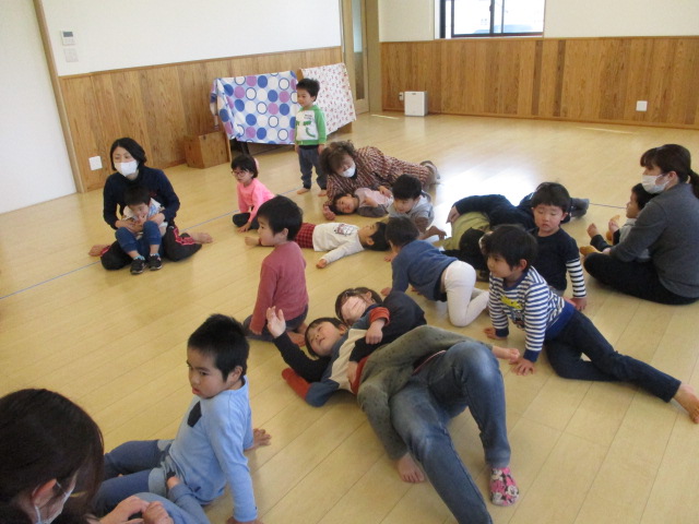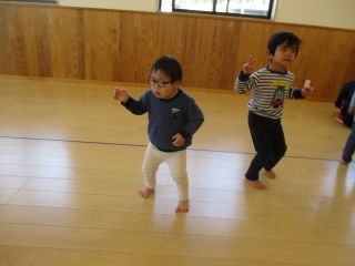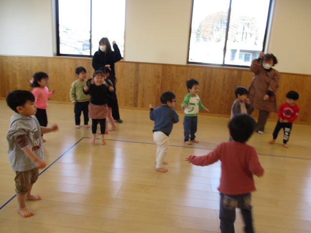 うたあそびをしました。♪ねじってツイスト~♪と音楽が鳴り始めると、大きく腕を上下に振ったりジャンプしたり。音楽が鳴り止むと「もう一回!」とアピールする子も。体を動かすことが大好きな子どもたちは思い切り楽しんでいました。