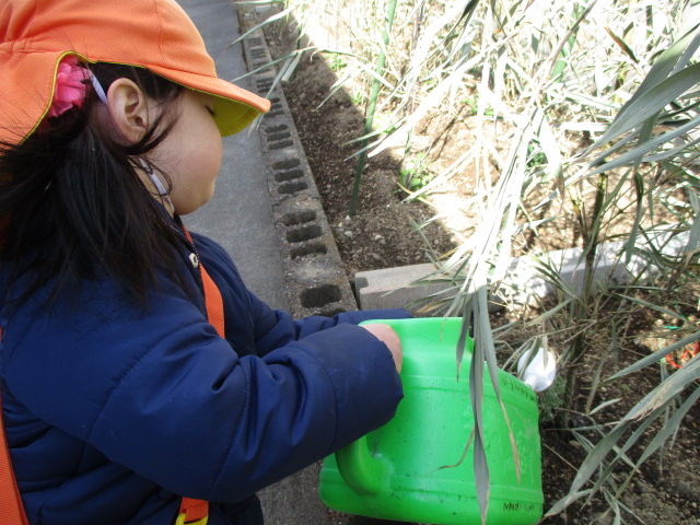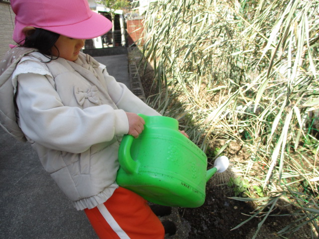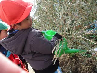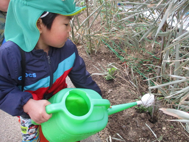 あははの畑に、エンドウ豆とそら豆が植えてあります。畑を見に行くと「はっぱ、はっぱ」といっていました。豆になることを伝えると「えー??」といって不思議そうに見ていました。「大きくなーれ」と言いながらじょうろで水やりをしました。収穫が楽しみです。