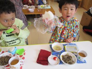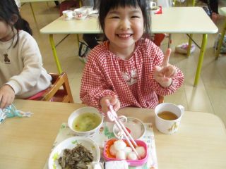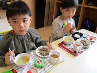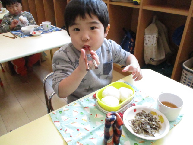 今日は週に一度のおむすびの日。「ぼくのは大きい!」「おいしーよ。」「まあるい。」「さんかくー!」大きいのや、小さいの、丸いのや三角おむすび!色々な形のおむすびがありました。お母さん、いつも愛情いっぱいのおむすびを握ってくれてありがとう(^^♪