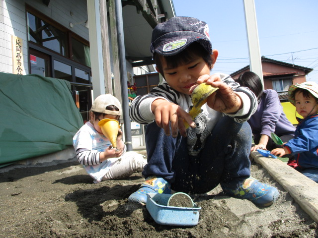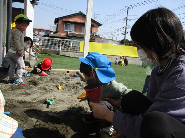 「何を作って遊ぼうかな~?」と砂場で遊ぶ友だちが続々やってきます!