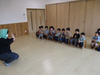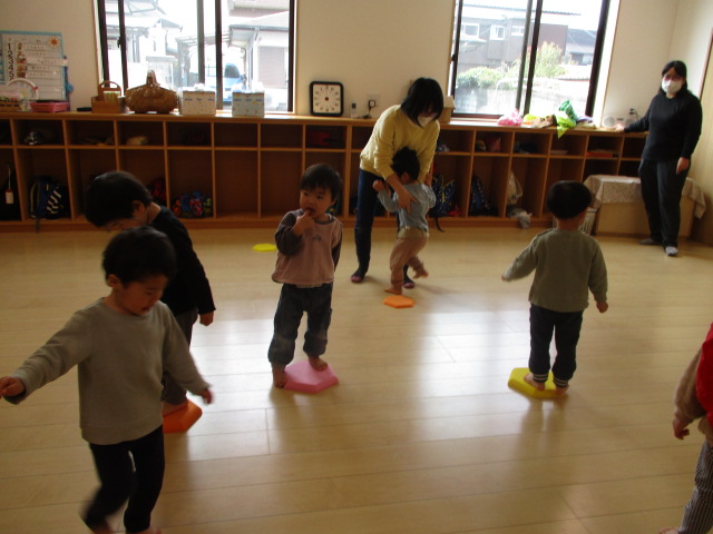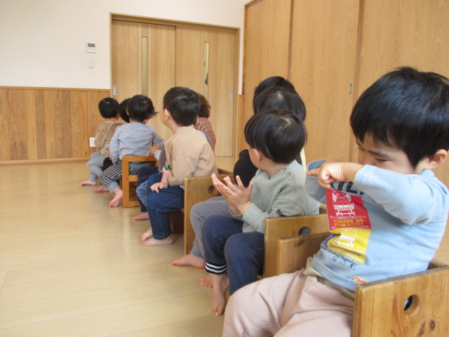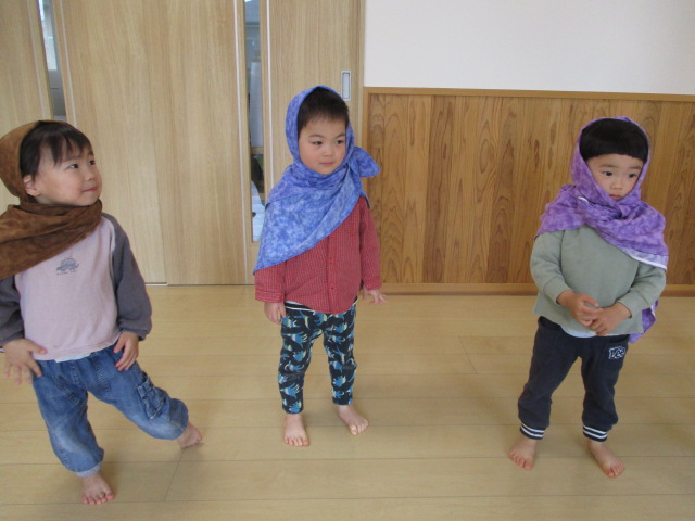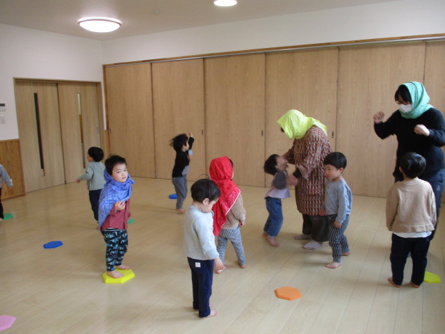うたあそびをしました。扉の向こうに何やら人影が・・・。子どもたちがドキドキしながら待っていると「ジャーン!」現れたのは忍者ではありませんか!!ビックリして子どもたちは目が点(笑)ビックリして泣き出す子もいましたが、みんなで忍者になって走ったり、ゆっくり歩いてみたり。楽しんでいました。