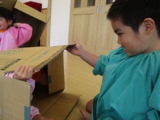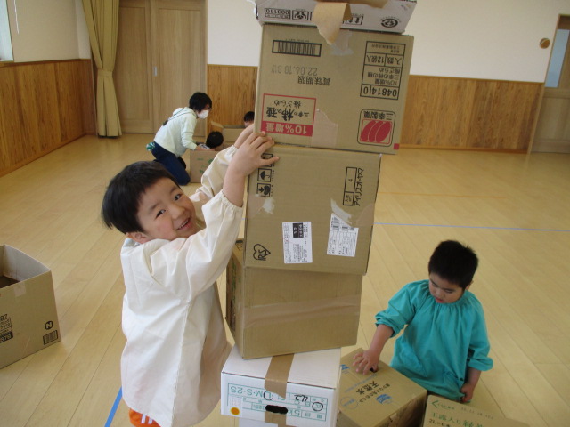 新学期が始まり、ドキドキしていた子どもたち。少しずつ笑顔が見られるようになってきました。そんな中、ダンボールあそびでは積み上げたダンボールを倒したりかくれんぼしたりと、とびっきりの笑顔をみせてくれました。「まだあそびたい」と話したり「たのしかったー」と満足する子どもたちでした。