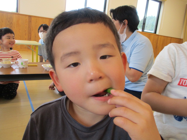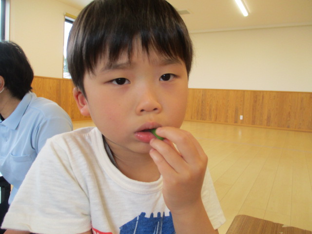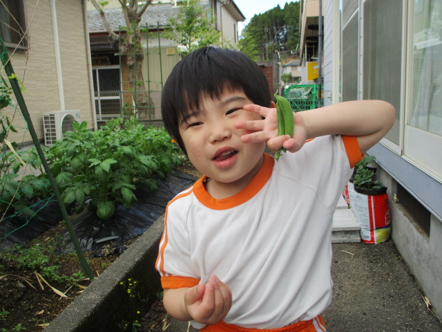畑に植えていたスナップエンドウの苗がすくすく伸びてたくさんの実がなったので、まんまるの子ども達で収穫してさっそく食べました!ポリポリ・・・いい音!ほんのり甘くて不思議な味。「美味しい!」と言って次々に手を伸ばす子、一口食べて「なんとも言えない・・・」という表情をして手が止まる子、様々な子どもたちの姿を見る事が出来ました。
