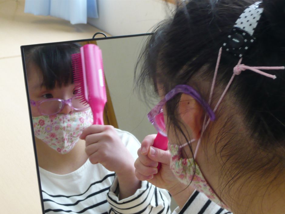 緊張した面持ちで髪をとかしていました。何回もしているとだんだん上手に。他にもヘアピンで自分の髪を飾ったり、
