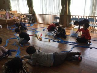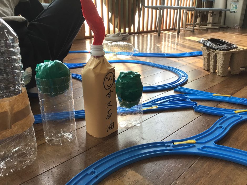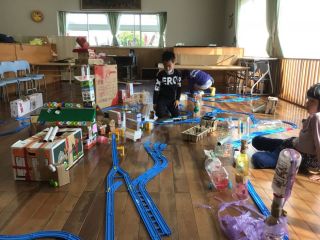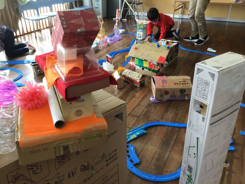 最終日にプラレールを敷き詰めた合間にそれらを飾って、電車を走らせました!友達との会話も弾んで楽しい街づくりが出来ました!