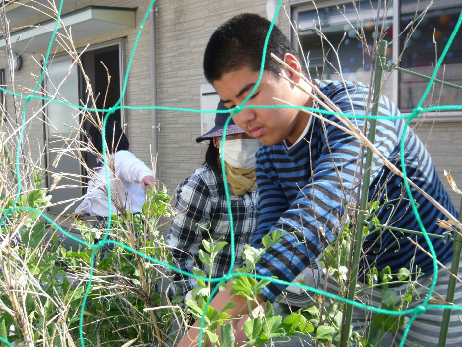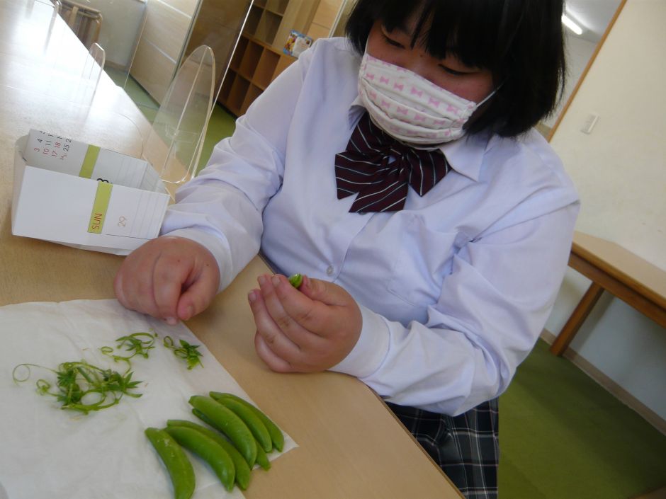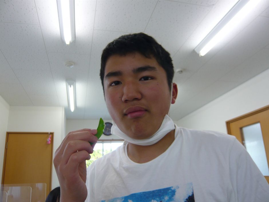 なかまの畑になっている¨スナップエンドウ¨をとってきて、みんなで食べてみま した。あまり野菜が好きでない子どもたちも、¨マヨネーズ¨に釣られてか、バク バク食べていました。 野菜の名前¨スナップエンドウ¨。子どもたちは「えっ¨プ¨?!スナックと思っ ちょった!」とみんなで笑った出来事でした。