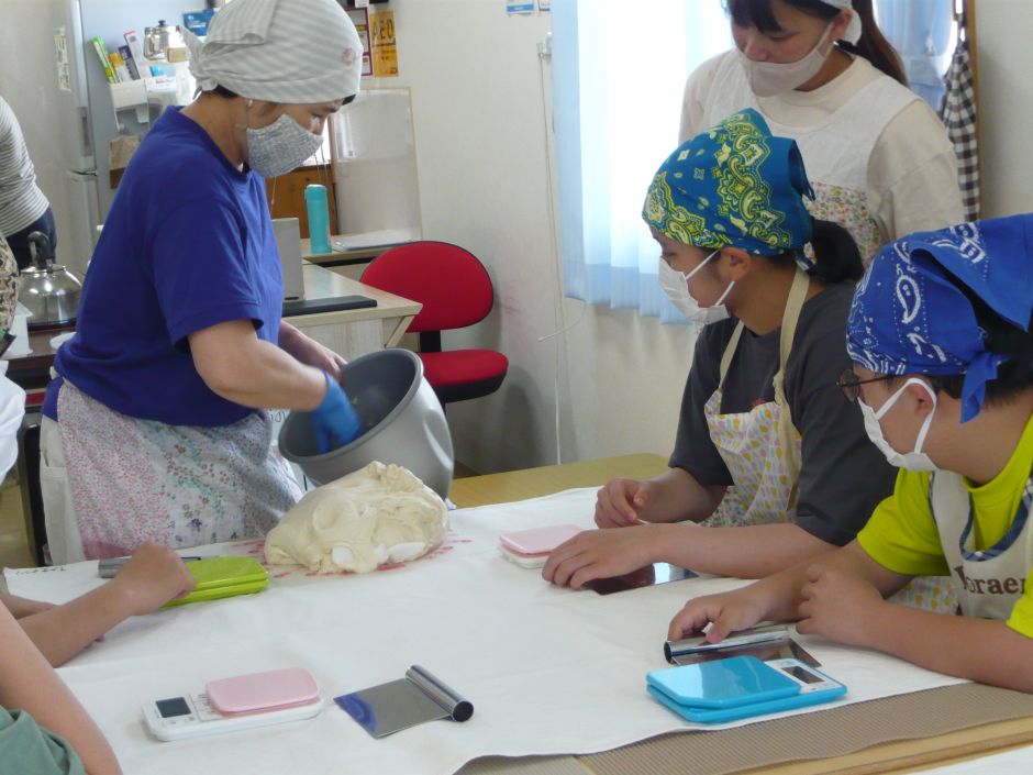 待ったパン教室にはりきっている2人。もう1人は高校生。自ら「やってみた