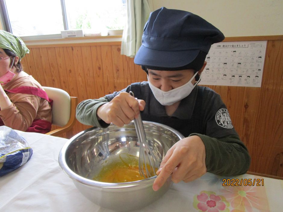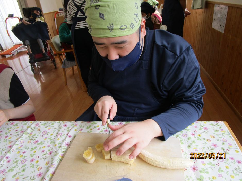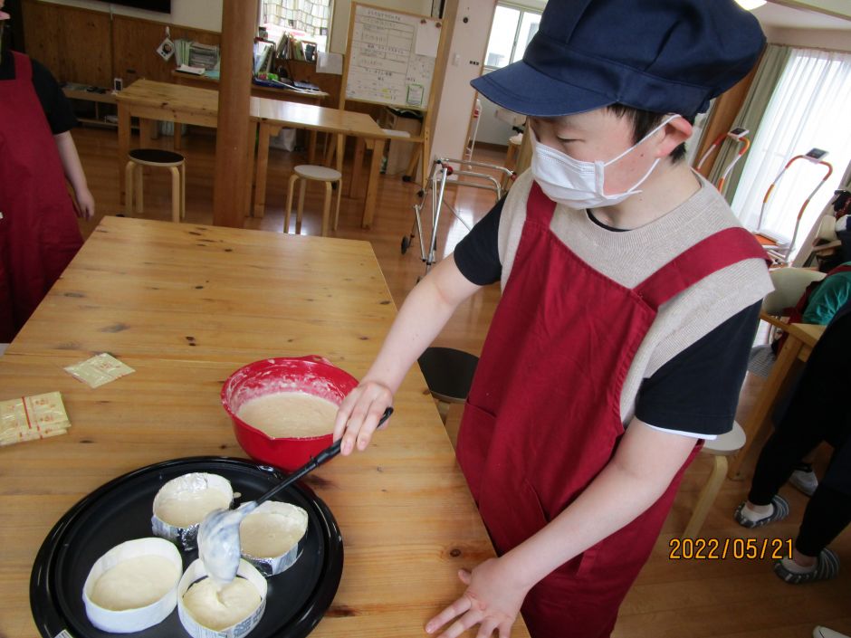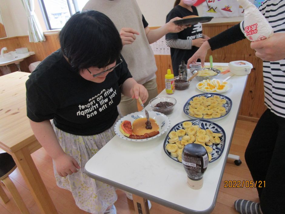 今回のクッキングは、パンケーキ🥞卵を割る人、バナナを切る人、生地を混ぜる人、役割り分担して作りました。みんな朝から楽しみにしていて、張り切って作業しましたよ!焼けるのが待ちきれずに型を外したり、ワーワー言いながらひっくり返したり、楽しいクッキングになりました。食べる前は、自分たちで好きなものをトッピング!!控えめな方ばかりで、すこーししかトッピングしないので、お手伝いしてたくさん乗せてあげました。
