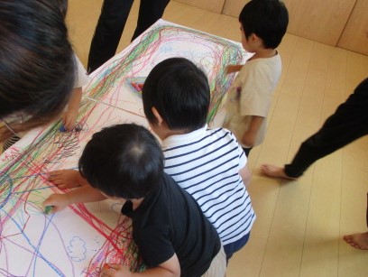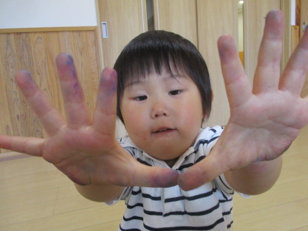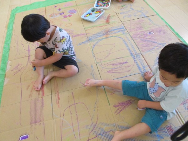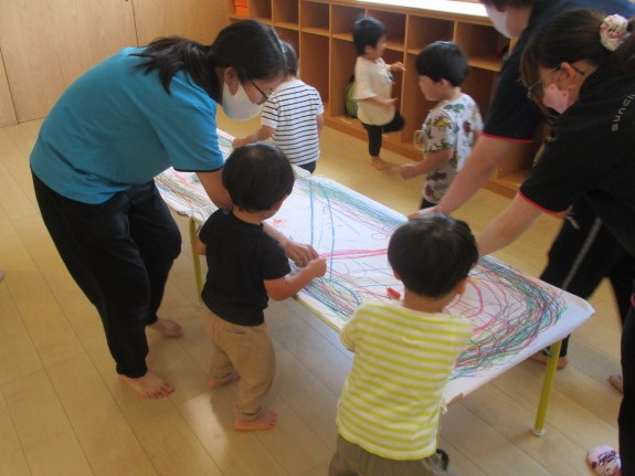 かぶとむしグループのみんなでおえかきをしました。机の周りをぐるぐる回って線路を書くように連なって楽しんだり、座り込んで夢中になって書いたり…手についたクレヨンを不思議そうに見つめたり…時間いっぱい楽しみました!